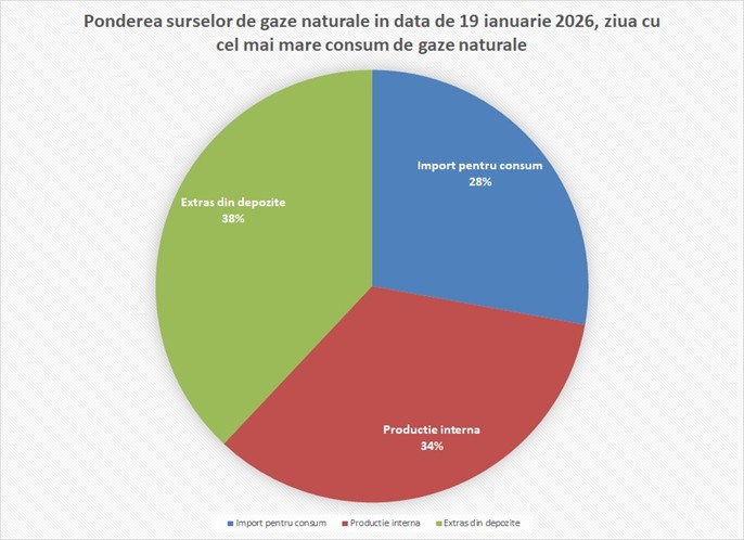 Gazele din depozitele de gaze au fost principala ”sursă” care a acoperit consumul în ziua cu cel mai mare consum de gaze din anul 2026,  dar în fapt situația din România a fost salvată de gazele din import, care au avut cea mai mare flexibilitatea, având o creștere de aproape 500 % față de media lunii (față de 14% flexibilitatea gazelor din înmagazinare și 0,1% a gazelor din producția internă).