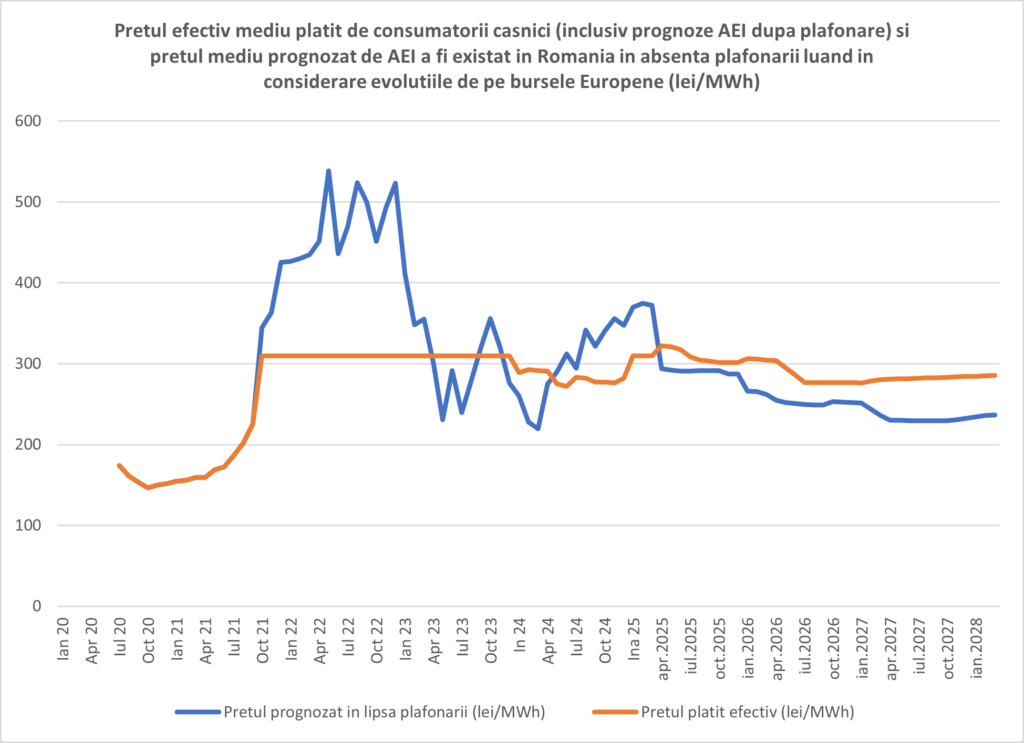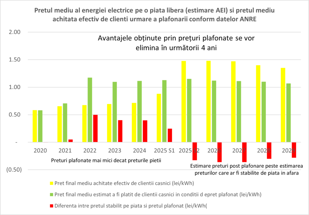 Analizând pentru perioada 2020 – 2025, evoluția prețului mediu achitat efectiv de clienți urmare a plafonării conform datelor ANRE și previziunile prețului mediu al energiei electrice care s-ar fi format pe o piață liberă, dacă nu se aplica plafonarea prețului (estimare AEI) și estimările de preț pentru cele două scenarii pentru următorii 4 ani se poate constata următoarele: