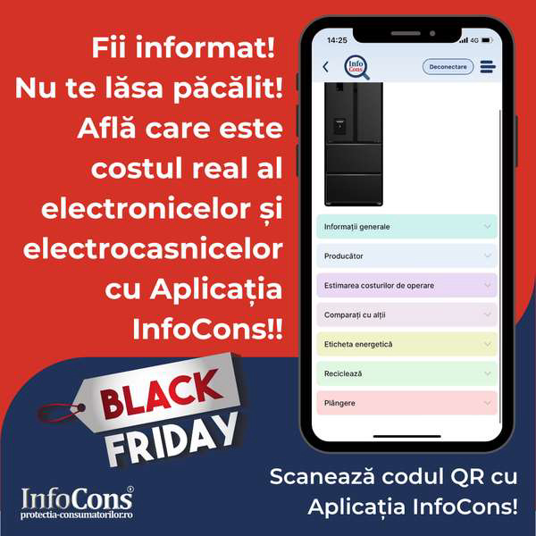 Pentru aceasta, Aplicația InfoCons vine în sprijinul consumatorilor cu calculatorul pentru estimarea costului de utilizare a produsului în cei doi ani de garanție. Altfel spus, consumatorii vor putea să estimeze costul aferent consumului de energiei pentru fiecare produs scanat. De asemenea, prin intermediul Aplicatiei InfoCons, consumatorii pot compara produsele electronice și electrocasnice pe care și le doresc de Black Friday, pentru a achiziționa produsul potrivit preferințelor și nevoilor lor.