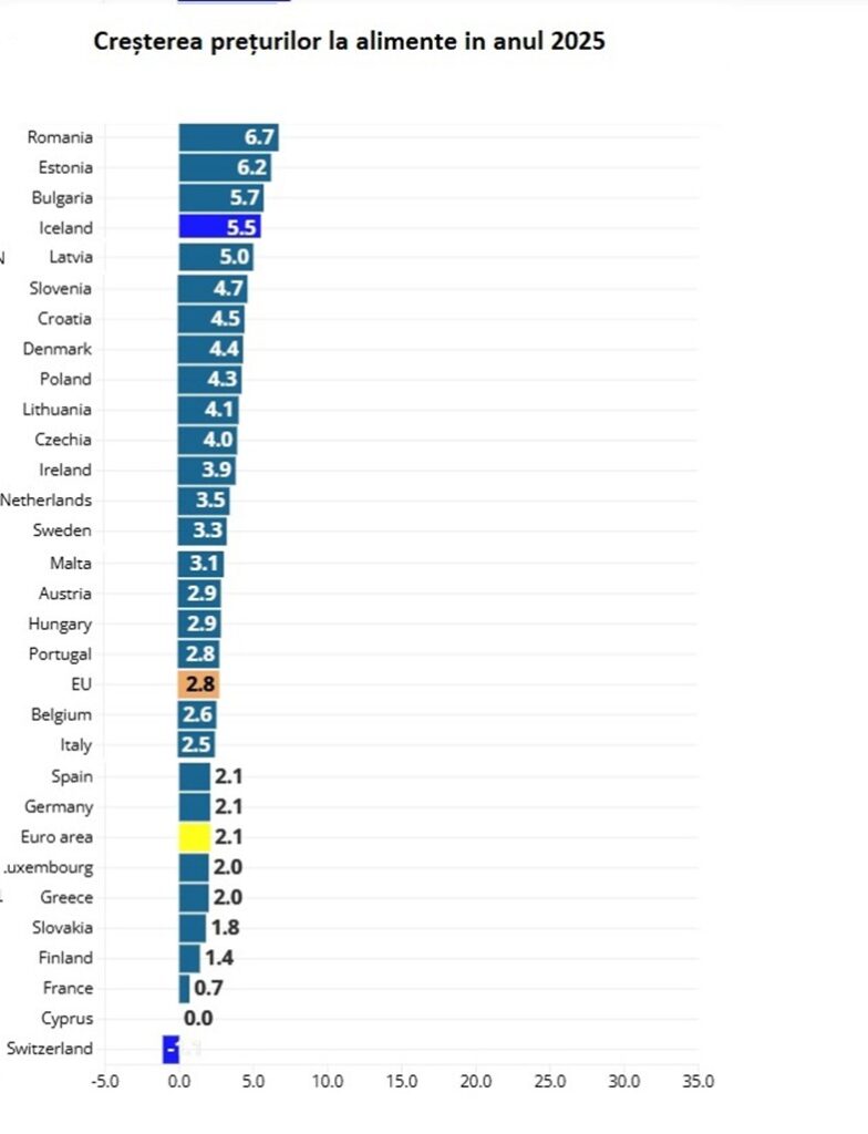 Datele nu mai lasă loc de interpretări optimiste. Conform celor mai recente statistici ale Eurostat privind inflația alimentară din Uniunea Europeană, România sa situat în 2025 pe primul loc la creșterea prețurilor la alimente. În timp ce media europeană a fost de 2,8%, România a înregistrat o creștere de 6,7% — de peste două ori mai mare decât media UE și cea mai ridicată rata dintre toate statele.
