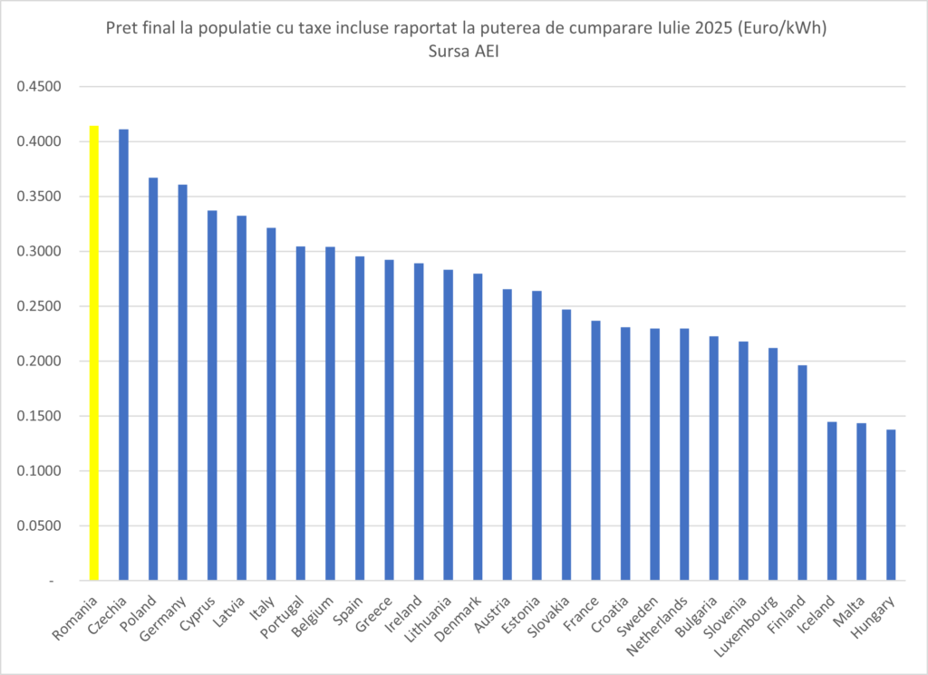În fapt în luna iulie 2025 România a înregistrat pentru populație cel mai mare preț al energiei electrice raportat la puterea de cumpărare din Europa.